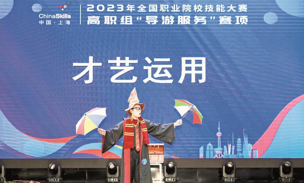 来自上海旅游高等专科学校旅游管理专业的大三学生王伟是上海代表队参赛选手之一,他凭借出色发挥获得“导游服务”赛项一等奖。王伟不仅专业技能过硬,还拥有“十八般武艺”。参加国赛,王伟的开场别具新意——用口琴吹响电影《八佰》里的音乐,以此引入自己的讲解。“口琴是特意学的,希望有这样创意的开头打动裁判。”