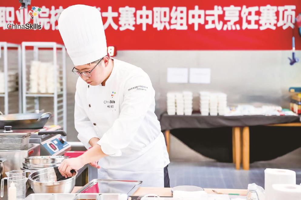 在2023年全国职业院校技能大赛“中式烹饪”赛项比拼中,上海市城市科技学校教师张越之与两名学生共同组成参赛队,获得二等奖。