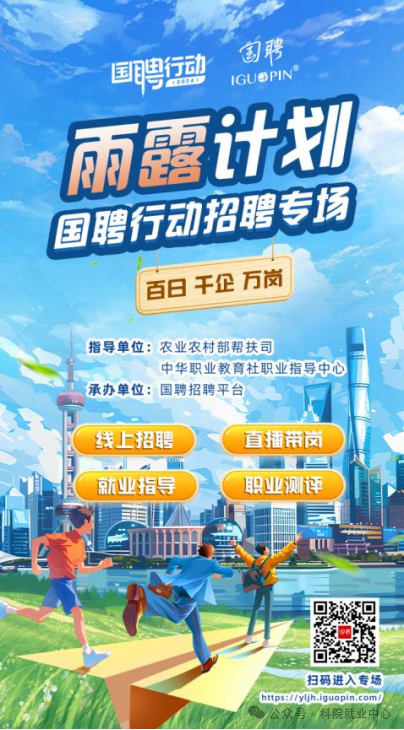 为深入贯彻落实习近平总书记关于做好高校毕业生就业工作重要指示,促进职业院校“雨露计划”毕业生高质量充分就业,农业农村部帮扶司联合中华职业教育社职业指导中心,协调指导国聘招聘平台和智联招聘平台,开展“雨露计划”就业帮扶公益行动,组织“百日、千企、万岗”集中双选,为“雨露计划”毕业生精准匹配推送就业信息,提供就业培训指导,帮助实现稳定就业。